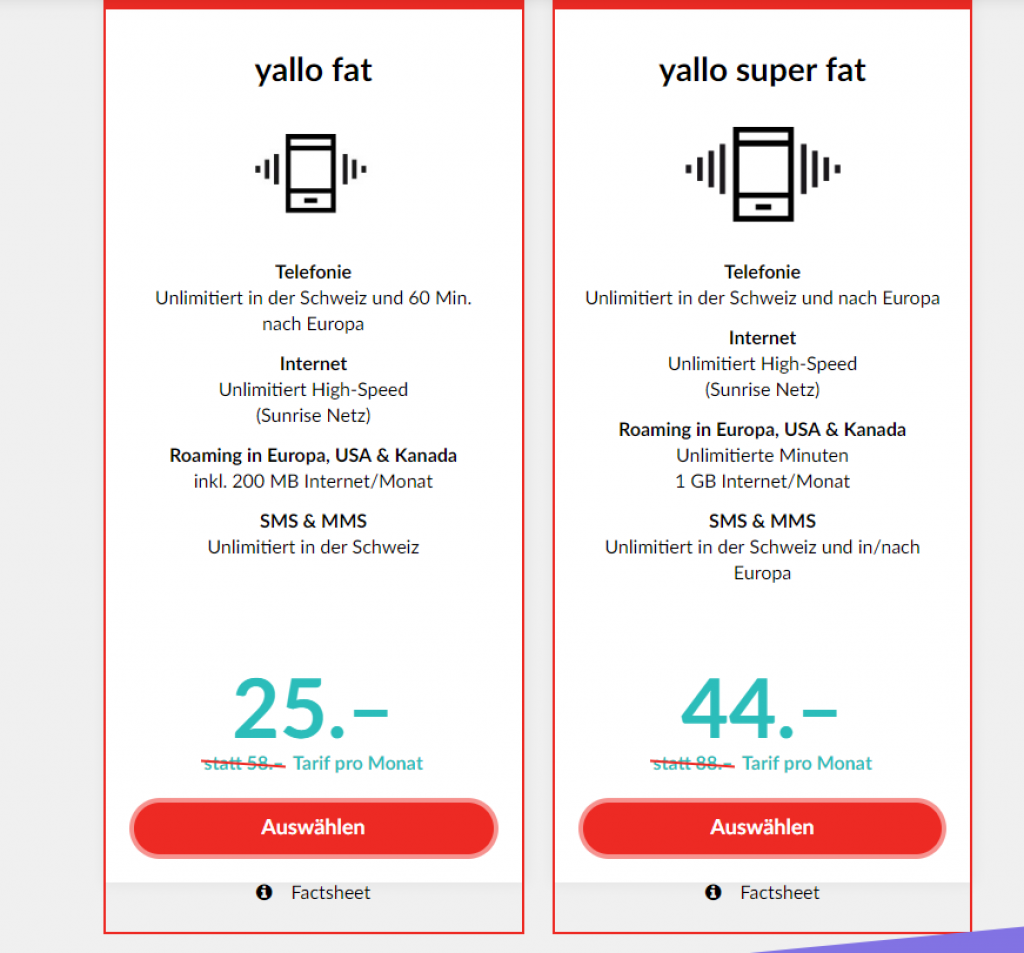 Ich hatte erst die Yallo Super Fat für 44chf, am BLACK FRIDAY angerufen, und die super fat meiner Frau & meine auf 35chf umgestellt, und am 17 Juni Angebot in meinem Account auf yallo super fat XL für 48chf statt 120chf umgestellt mit roaming von 40gb.