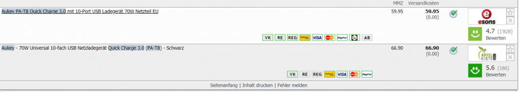 AUKEY PA-T8 Quick Charge 3.0 USB Ladegerät 70W 10 USB Ports, 70W weiss, im Moment für €19,99