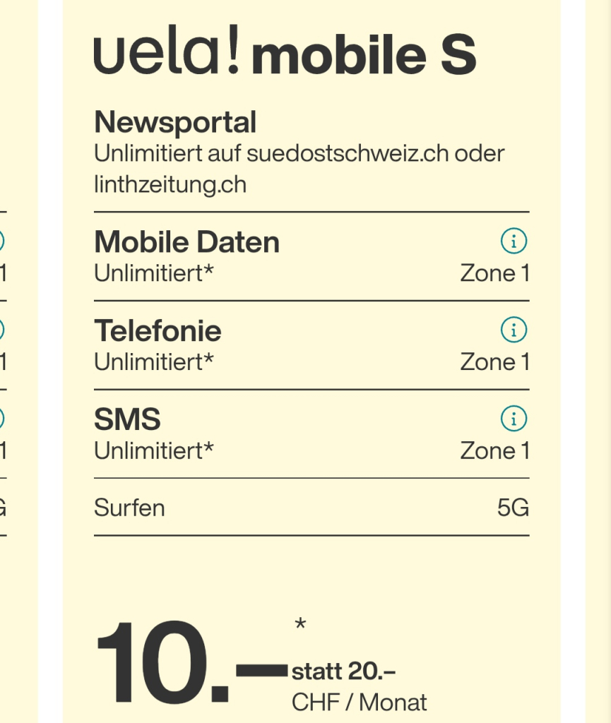 Bei Uela (Sunrisenetz) bekommt Ihr aktuell fur nur 10.- pro Monat eine Handy Flatrate.