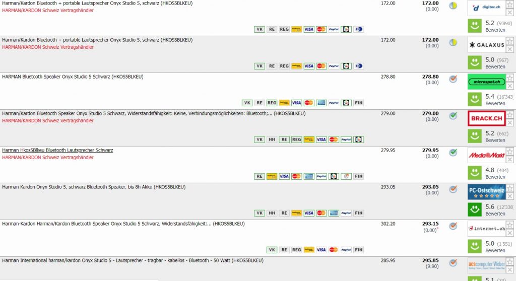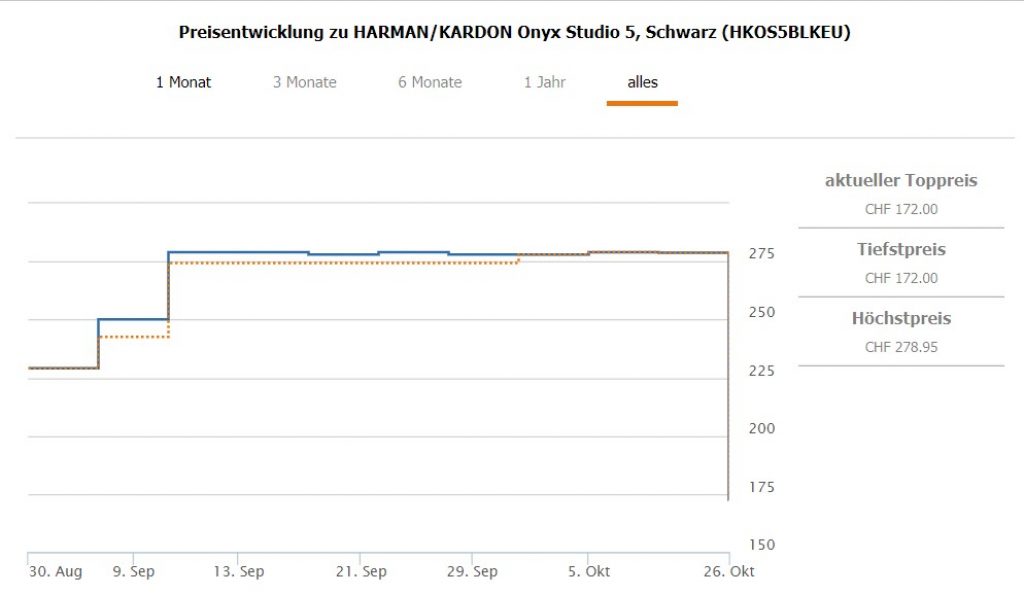 Zweitbester Preis in der Schweiz beträgt über alle Farben CHF 278.80, Bestpreis bisher lag bei CHF 229.-