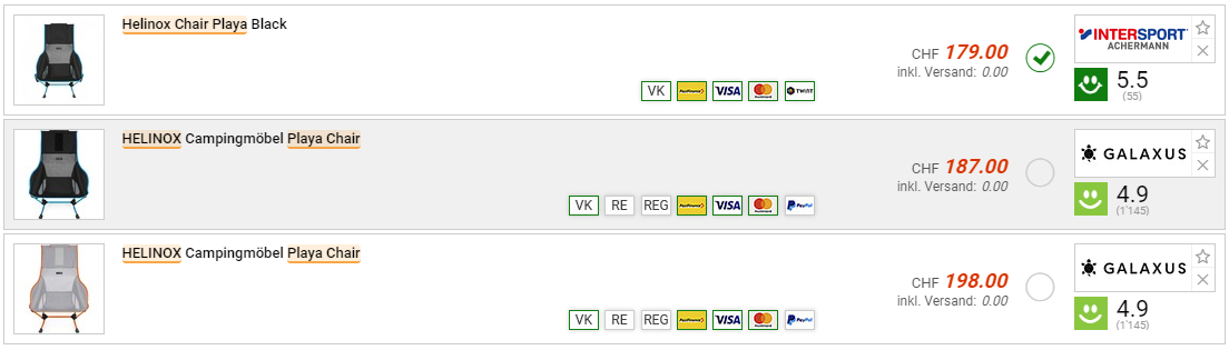 Bei DayDeal ist heute der Helinox Playa Chair für den Bestpreis von CHF 99.- im Angebot. Ein Preisverlauf ist leider nicht vorhanden. Der zweitbeste Preis beträgt CHF 179.-.