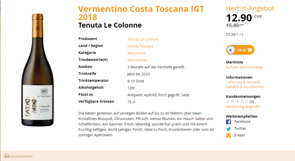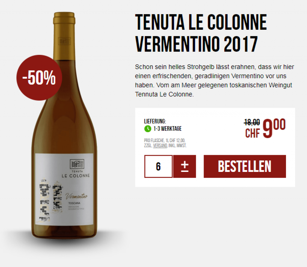 Der Tenuta Le Colonne Vermentino 2017 kostet dort CHF 9.- und bei vinothek-brancaia CHF 12.90.