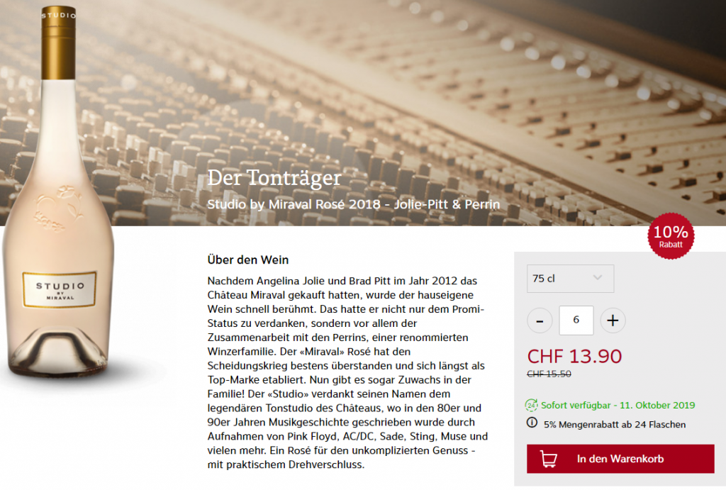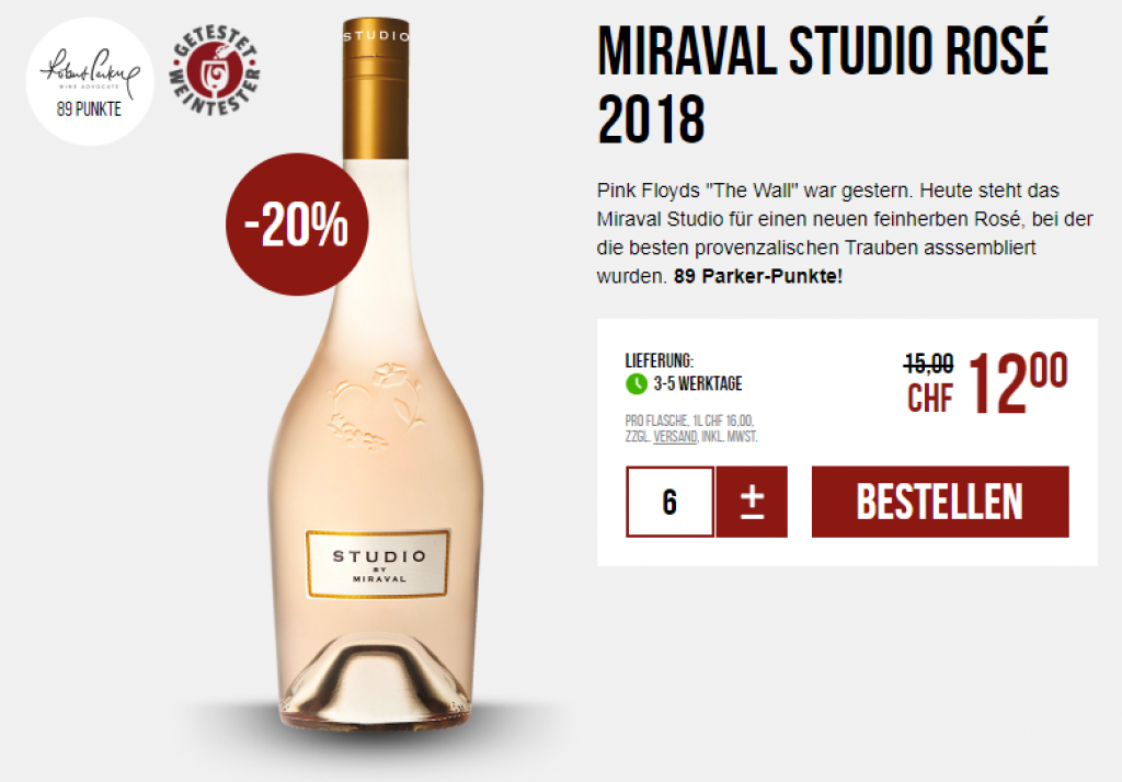 Der Miraval Studio Rosé 2018 kostet dort CHF 12.- und bei flaschenpost.ch CHF 13.90.