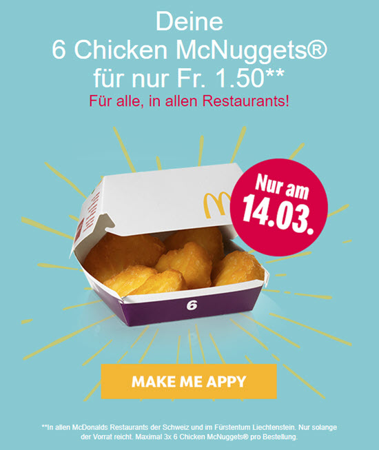 Am 14.3.2019 gibt es bei McDonald’s anlässlich der AppyWeeks 6 Chicken McNuggets für CHF 1.50. In der App gibt es noch mehr Coupons für weitere Produkte.