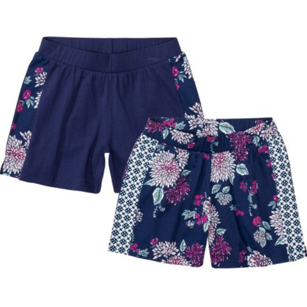 Die eine Shorts ist dunkelblau mit Blumen auf der Seite und die andere ist komplett geblümt.