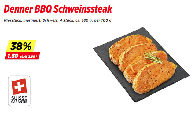 oder 4 BBQ Schweinssteaks für CHF 1.28 per 100g.