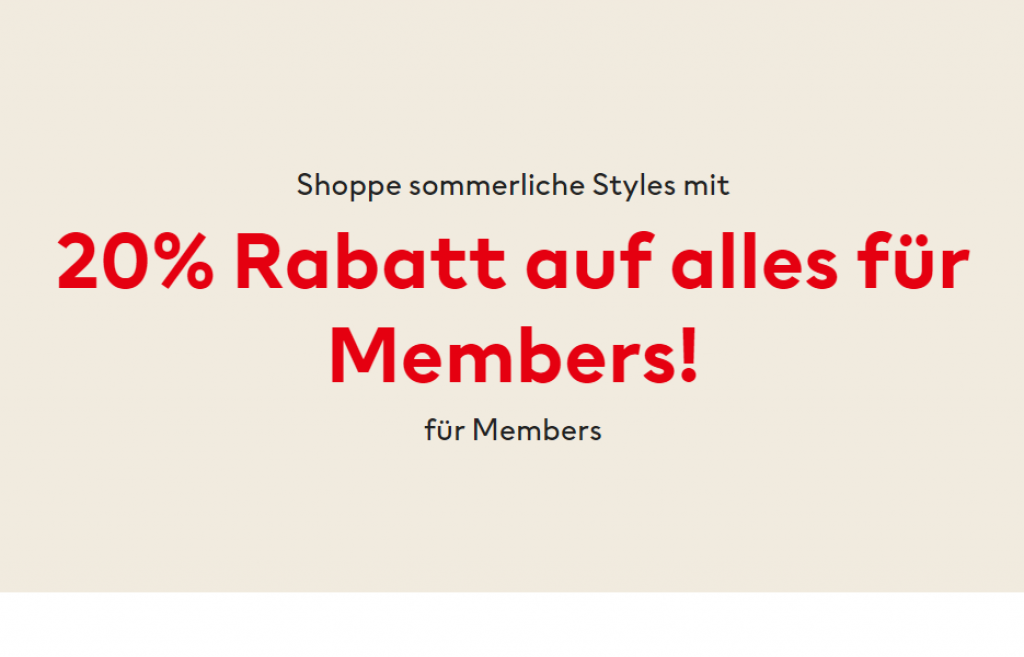 Bei H&M könnt ihr nur noch bis zum Sonntag von 20% Rabatt auf Alles profitieren! Um vom Deal zu profitieren, müsst ihr euch einen H&M Mitgliederaccount zulegen. Dieser ist komplett kostenlos und damit erhaltet ihr auch sonst diverse Vorteile wie z.B. kostenlosen Standardversand für den ersten Einkauf, 25% Rabatt zum Geburtstag, exklusive Angebote und vieles mehr.