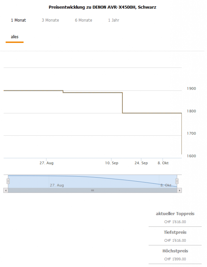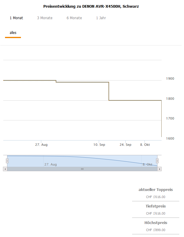 Gemäss toppreise gab es den Receiver über alle Farben bislang nie günstiger als für 1799.- CHF was zugleich aktuell auch der zweitbeste Preis ist.