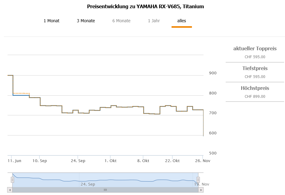 Gemäss toppreise war der bestprice über alle Farben bislang bei 692.90 CHF, der zweitbeste Preis aktuell liegt bei 702.25 CHF.