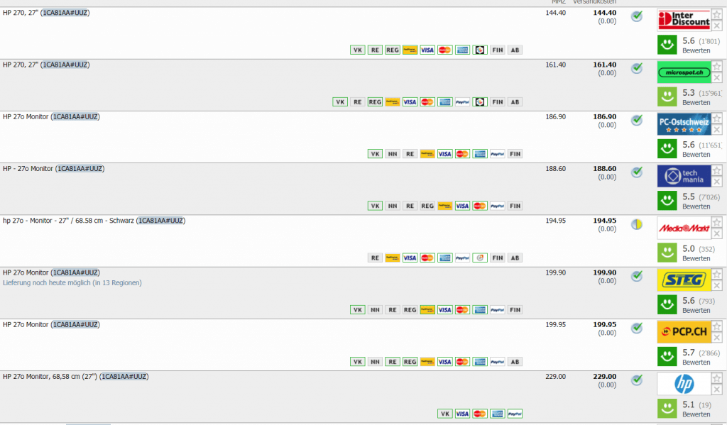 Bei Interdiscount gibt’s gerade den HP 270 27“ PC-Monitor für CHF 134.40, wenn du den Gutscheincode HFWID10 benutzt. Der zweitbeste Preis in der Schweiz liegt bei CHF 194.20 CHF 161.40. Leider sind keine historischen Preisdaten auf toppreise verfügbar. Auf Comparis ist der tiefste gemessene Preis diesen Januar bei CHF 161.40.