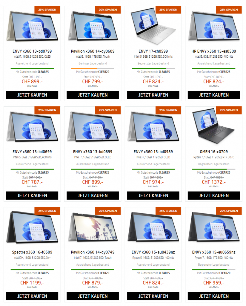 Bei HP gibt’s gerade den Clearance Sale, welcher wohl die Lager komplett leer fegen soll. Es sind diverse Modelle im Angebot, von Office PCs über Gaming Laptops bis hin zu Zubehör.