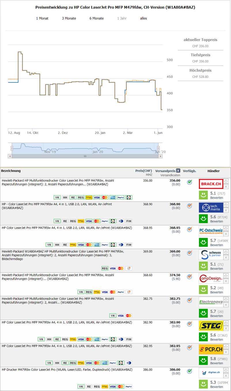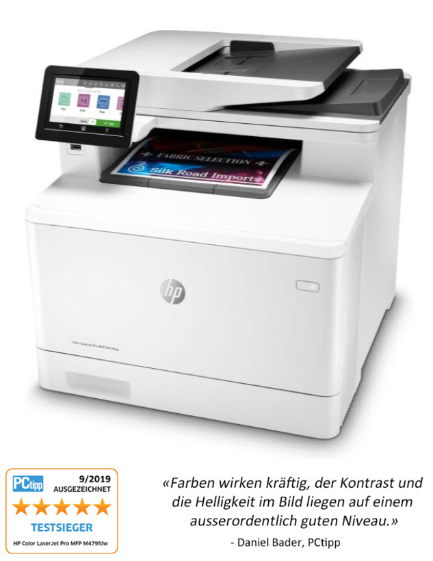 Bei Brack gibt es aktuell den HP Multifunktionsdrucker Color LaserJet Pro MFP M479fdw zum Preis von CHF 356.-. Da aktuell zwei Promos auf diesen Drucker laufen, kann man anschliessend noch CHF 100.- Cashback geltend machen und bekommt bei HP nach Registration zusätzlich eine Garantieverlängerung auf 3 Jahre. Somit kommt dieser Testsieger schlussendlich auf einen Bestpreis von CHF 256.- und hat 3 Jahre Garantie - kein schlechter Deal!