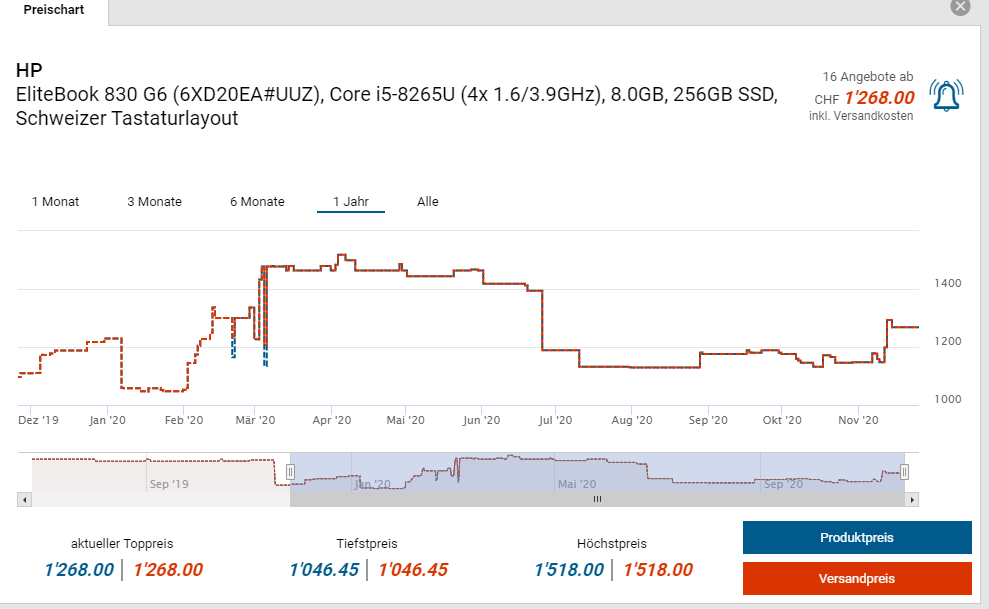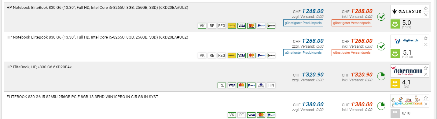 Bei Hayloft-IT gibt es momentan das HP EliteBook 830 G6 für den neuen Bestpreis von CHF 999.-. Der vorherige Bestpreis war CHF 1046.45. Der zweitbeste Preis beträgt CHF 1268.-.