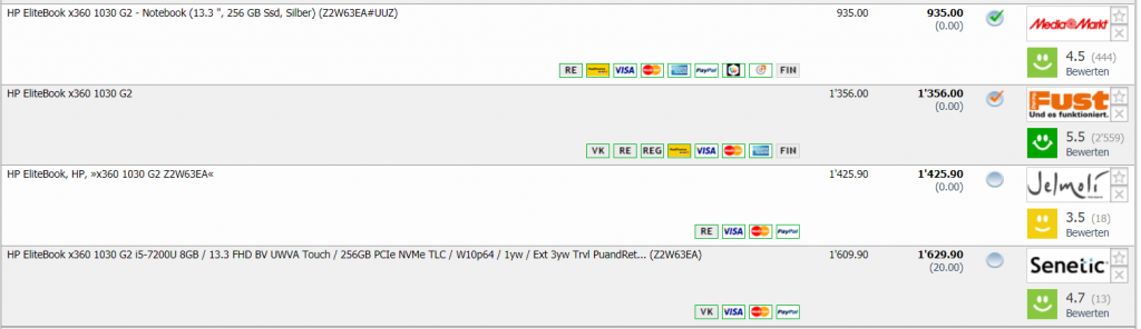 Auch noch im MediaMarkt Sale gesehen: Das EliteBook x360 1030 G2 mit i5 / 256GB SSD / 13.3“ für CHF 935.- Zweitbester Preis beträgt CHF 1356.- Bestpreis war bei CHF 1189.-