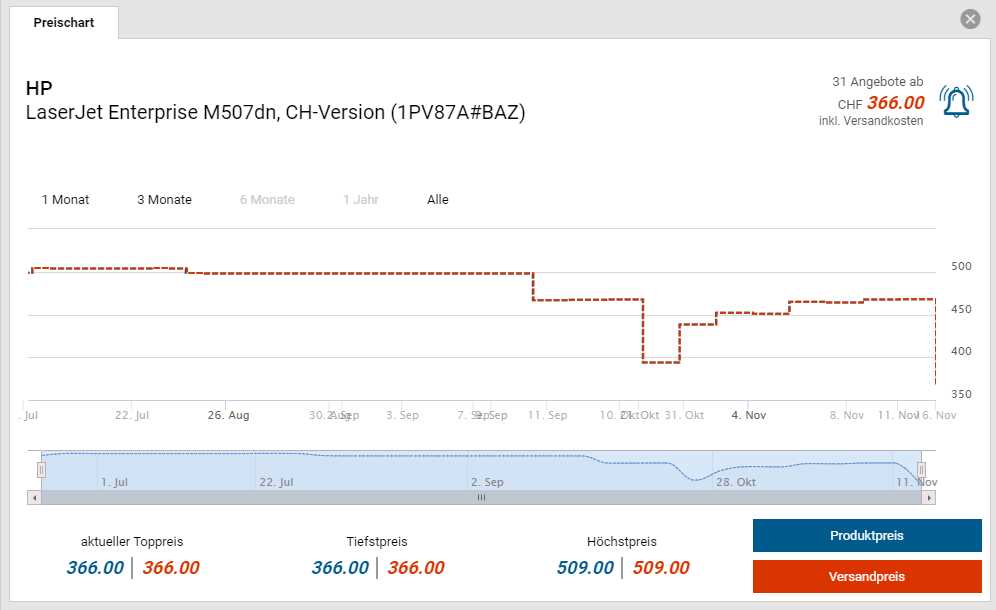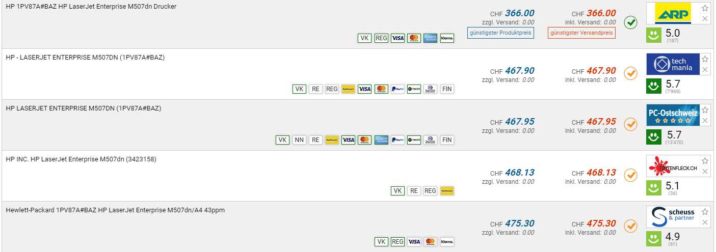 Bei ARP gibt es den HP LaserJet Enterprise M507dn Drucker für den neuen Bestpreis von CHF 366.-. Der vorherige Bestpreis war CHF 394.-. Der zweitbeste Preis beträgt CHF 467.90.