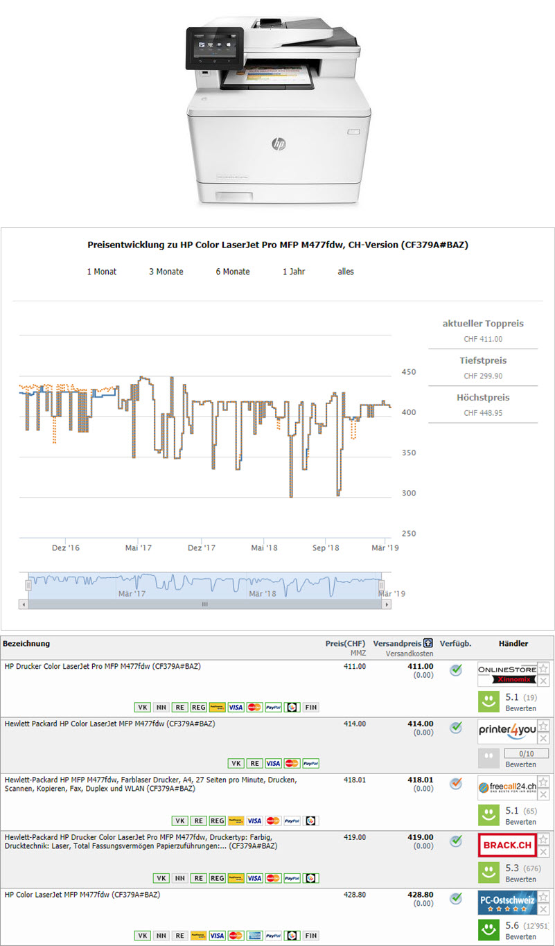 Bei Digitec gibt es gerade den HP M477fdw Color LaserJet Pro (WLAN, Laser/LED, Farbe, Duplexdruck) in Aktion für CHF 359.-. Da HP aber zeitgleich eine Cashback-Promo fährt, erhält man nach dem Kauf dieses Druckers von HP nochmals CHF 100.- zurückvergütet und kommt somit auf einen Gerätepreis von CHF 259.-.