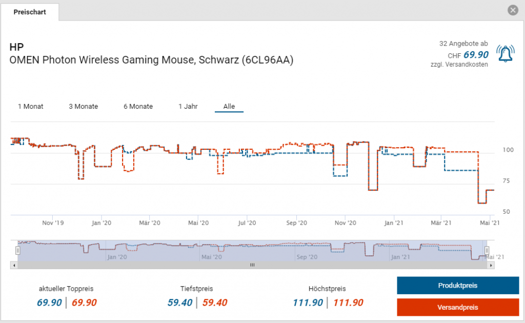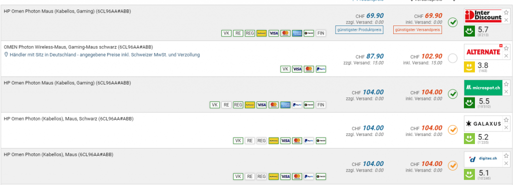 Bei Interdiscount gibt es die HP OMEN Photon Wireless Gaming Mouse für CHF 69.90. Vor wenigen Tagen war sie noch etwas günstiger bei CHF 59.40. Zum Muttertag kostet sie bei HP CHF 80.- (zweitbeste Preis).