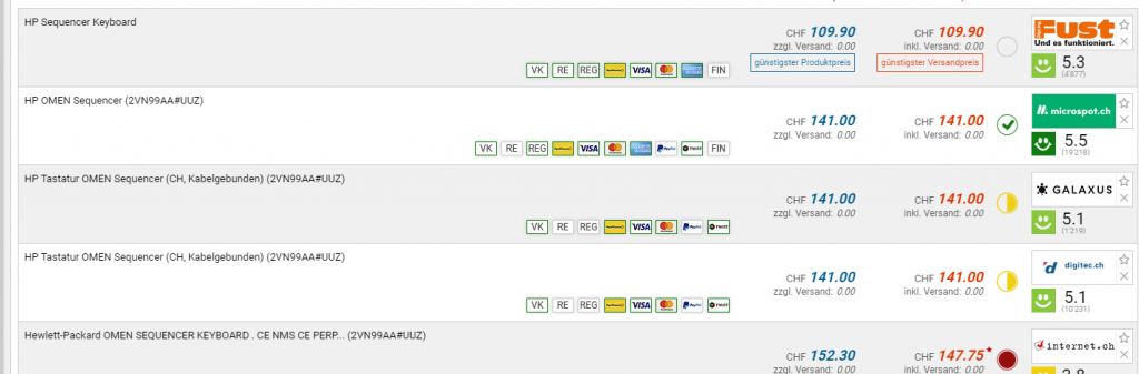 Bei Fust gibt es die HP OMEN Sequencer Gaming Tastatur für den Bestpreis von CHF 109.90. Im Januar 2020 gab es die Tastatur für CHF 99.50 und sie befindet sich öfter auf CHF 109.90. Der zweitbeste Preis beträgt CHF 141.-.