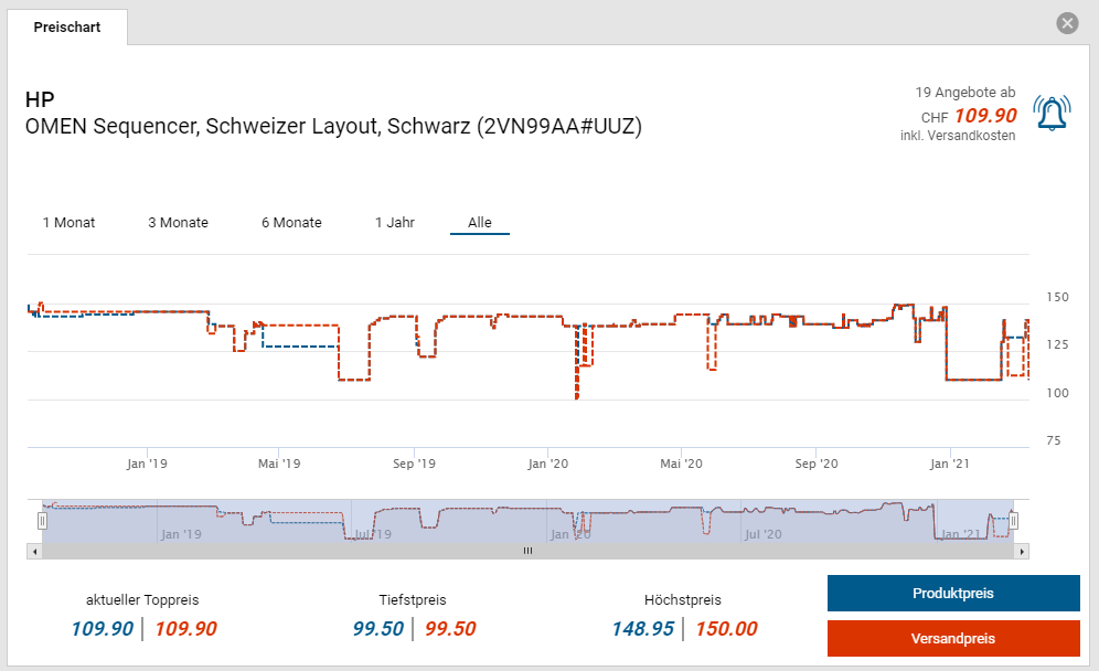 Bei Fust gibt es die HP OMEN Sequencer Gaming Tastatur für den Bestpreis von CHF 109.90. Im Januar 2020 gab es die Tastatur für CHF 99.50 und sie befindet sich öfter auf CHF 109.90. Der zweitbeste Preis beträgt CHF 141.-.