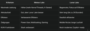 Wer Wert auf lange Akkulaufzeit, KI Funktionen und moderne Effizienz legt, ist mit dem Lunar Lake im Vorteil.