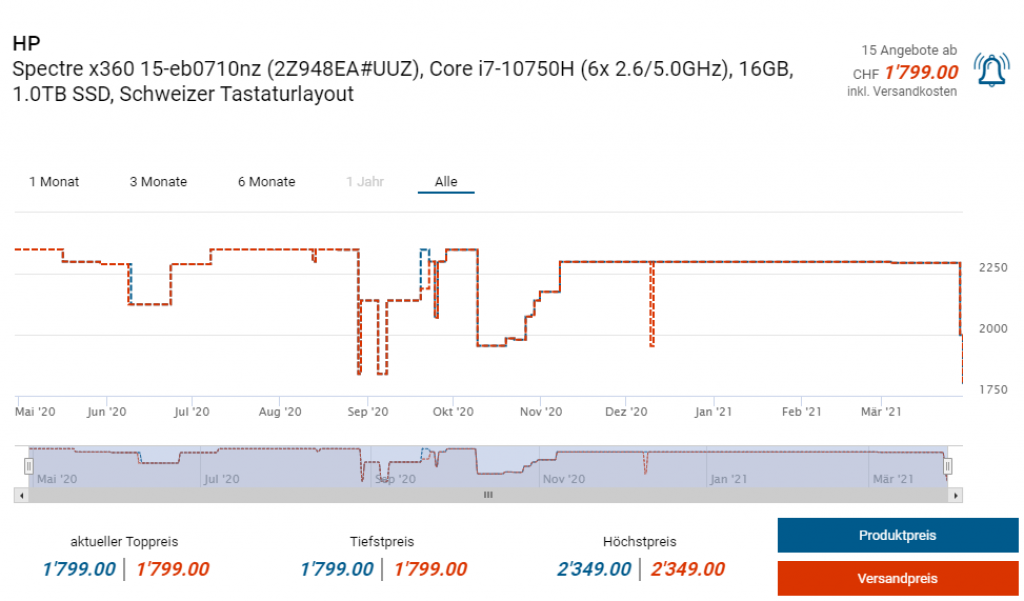 Bei microspot gibts derzeit das Convertible HP Spectre x360 15-eb0710nz mit der GTX 1650 Grafikkarte zum Aktionspreis von 1799 Franken. Laut toppreise liegt der Vergleichspreis derzeit bei 1999 Franken, zuletzt gabs gerade gestern dieselbe Konfiguration für CHF 1789.- bei melectronics in den 24h-Hits.