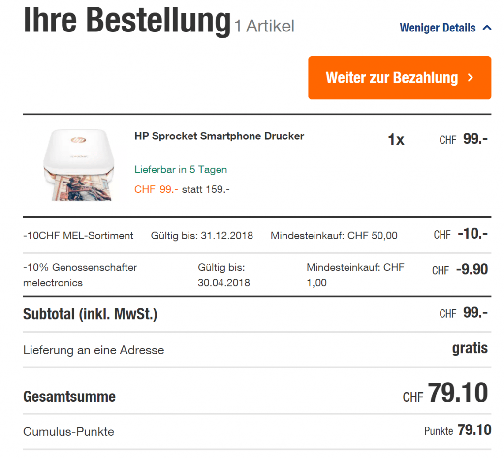 • Melectronics Newsletter abonnieren. Darin erhält man einen 10 Franken Gutschein – kann auf eine Wegwerfmailadresse gemacht werden.