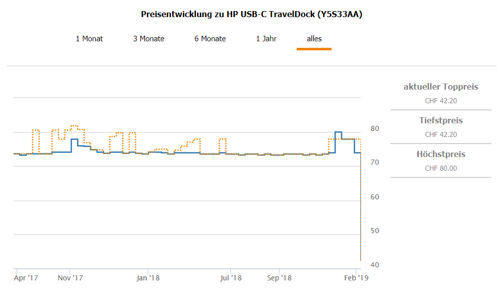 Beim Onlineshop bueroelektronik.ch gibt’s das HP USB-C TravelDock für CHF 42.20 Zweitbester Preis ist bei CHF 59.40. Bisheriger Bestpreis war etwas über 70 Franken, der Preis ist erst in der Nacht bei vielen Händlern gefallen.