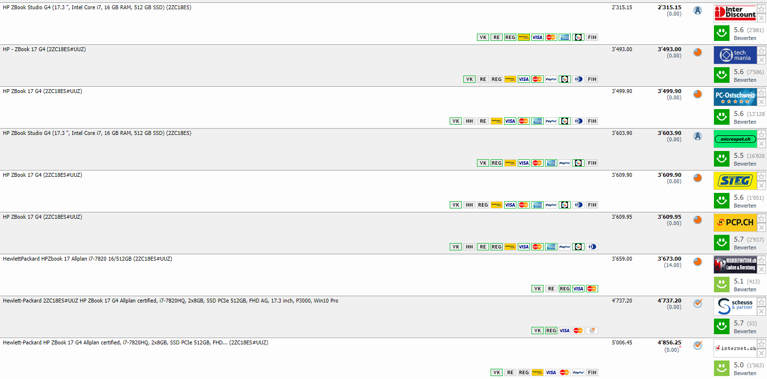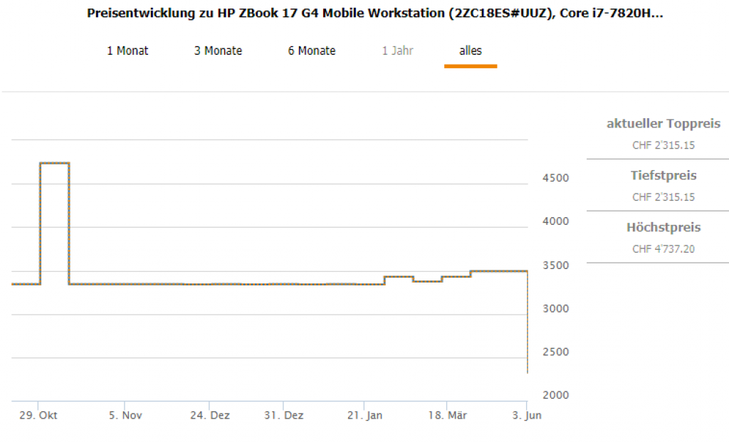Interdiscount bietet heute das HP ZBook Studio G4 (17.3 „, Intel Core i7, 16 GB RAM, 512 GB SSD) für CHF 2315.15 an. Laut toppreise.ch ist das Gerät damit erstmals für weniger als 3000 Franken erhältlich, und der beste Vergleichspreis sind CHF 3493.-.