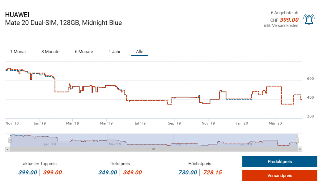 Bei Amazon gibts zurzeit das Huawei Mate 20 als Standardversion zum neuen Bestpreis. Dieser lag in der Vergangenheit bei 349 Franken, wenn man vom Preisfehler des Mate 20 Pro absieht 😉