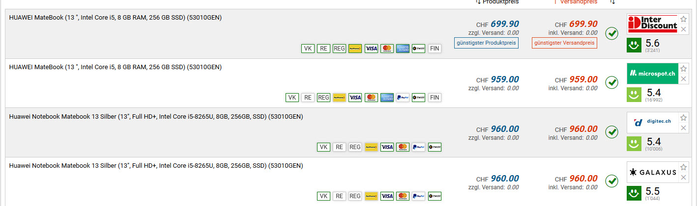 Das HUAWEI MateBook 13″ Intel Core i5, 8 GB RAM, 256 GB SSD gibt es gerade bei Interdiscount für 699.90 CHF. Zweitbester Preis ist 959 CHF.