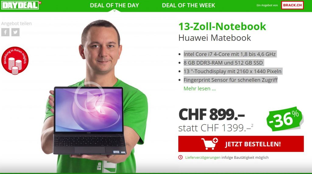 Bis morgen um 08:59:59 gibt es auf Daydeal.ch das Huawei Matebook (Modell 53010GCL) zum Bestpreis von CHF 899.-.