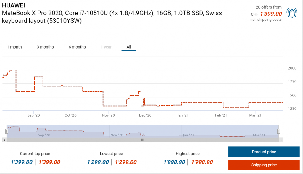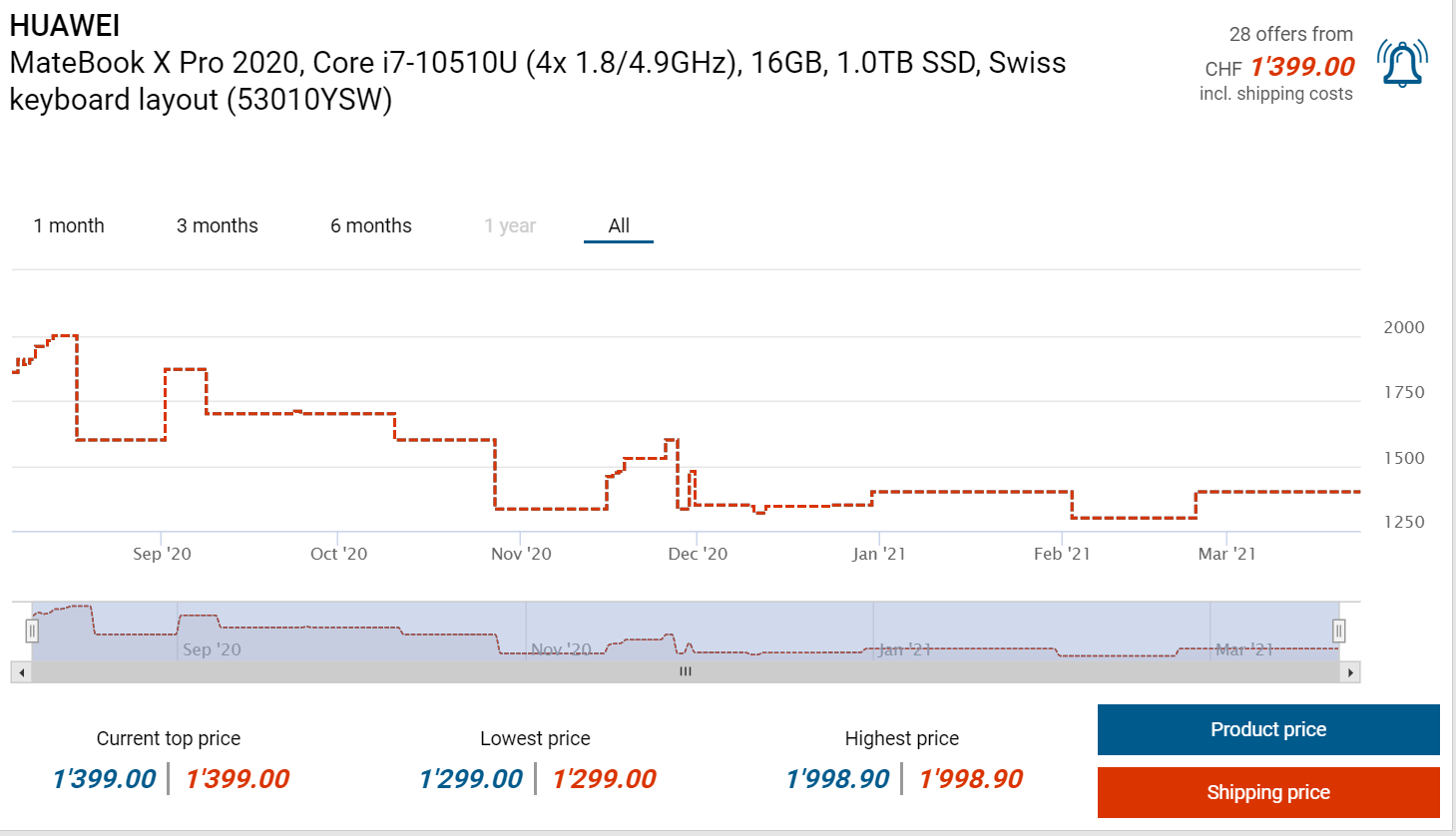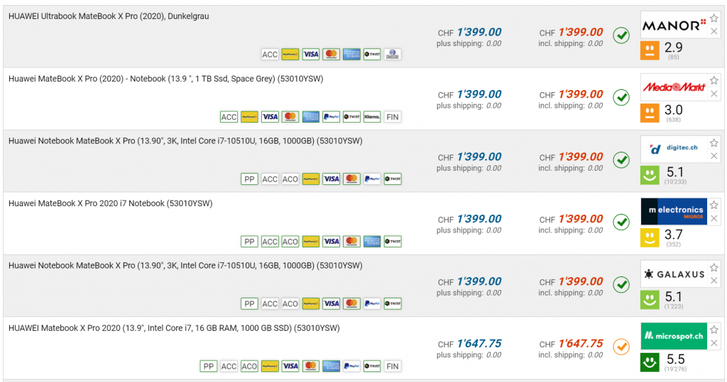 Huawei MateBook X Pro 2020 als Amazon Warehouse Deal auf Amazon UK. Zustand ist sehr gut und dank des aktuellen 30% auf WHD Angebots, für umgerechnet ~1100 CHF zu kriegen. Das einzige Problem ist, dass sie nicht in die Schweiz versenden. Aber vielleicht kennst du ja jemanden in einem der Grenzgebiete.