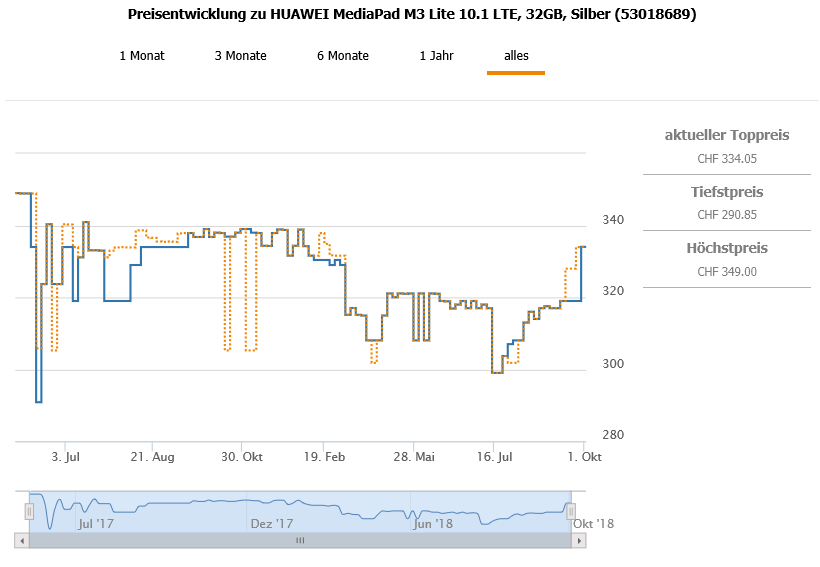Gemäss toppreise gab es das Tablet bislang nie günstiger als für 299.- CHF, der zweitbeste Preis liegt aktuell bei 334.05 CHF.