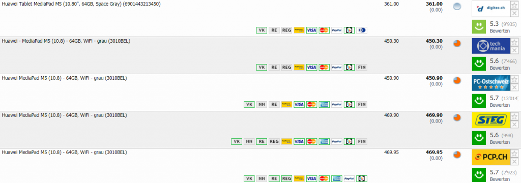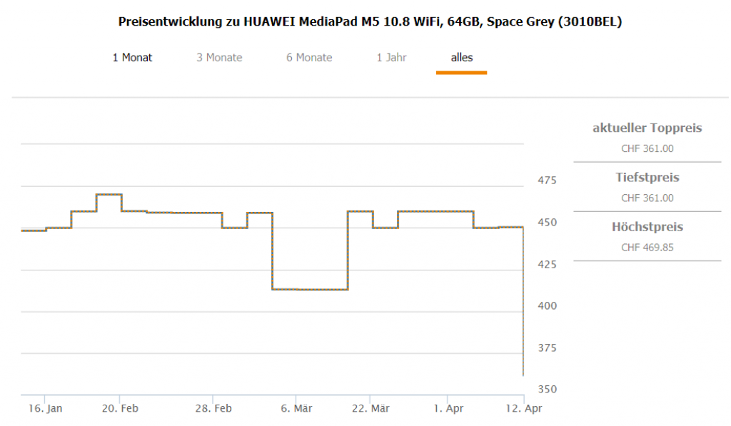 Bei digitec gibt’s das HUAWEI MediaPad M5 10.8 WiFi, 64GB in der Farbe Space Grey gerade für CHF 361.- Zweitbester Preis in der Schweiz beiträgt CHF 450.30 Bestpreis war bei CHF 413.-