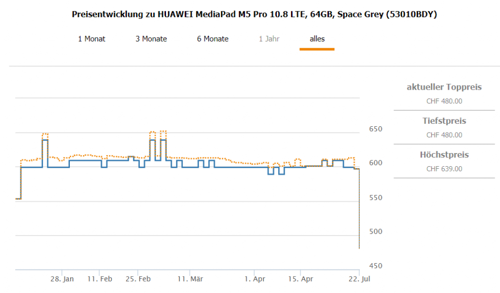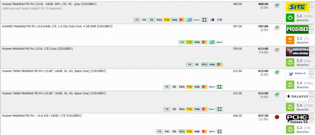Bei der PCP Gruppe (Steg, techmania, PC-Ostschweiz, PCP) gibt’s gerade das HUAWEI MediaPad M5 Pro 10.8 LTE, 64GB, Space Grey für CHF 480.- Nächstbester Preis beträgt CHF 597.- Bestpreis scheint bei CHF 552.90 gelegen zu haben.