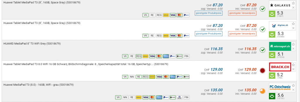 Bei Galaxus und dem Partner Digitec gibt es das HUAWEI MediaPad T3 16GB WIFI für den neuen Bestpreis von CHF 87.20. Der vorherige Bestpreis war CHF 99.-. Der zweitbeste Preis beträgt CHF 116.35.