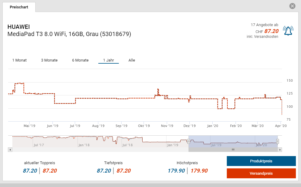 Bei Galaxus und dem Partner Digitec gibt es das HUAWEI MediaPad T3 16GB WIFI für den neuen Bestpreis von CHF 87.20. Der vorherige Bestpreis war CHF 99.-. Der zweitbeste Preis beträgt CHF 116.35.