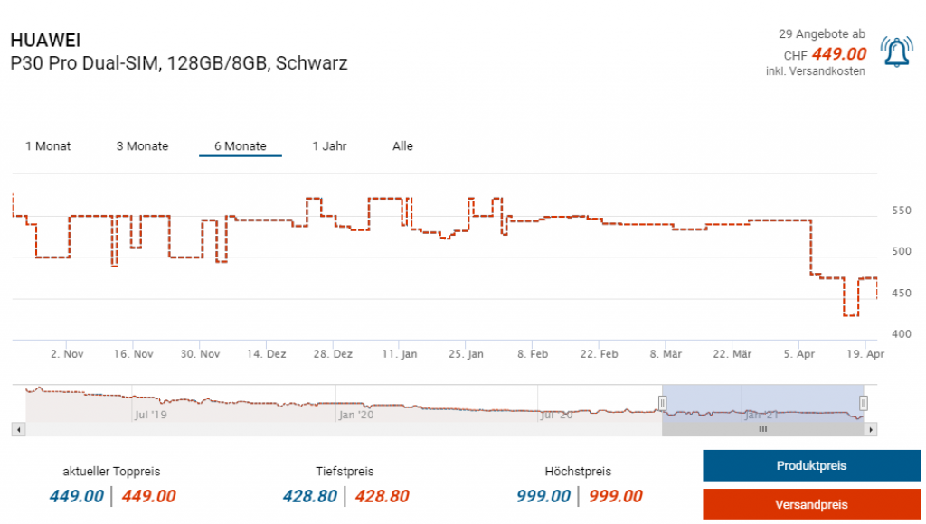 Im Post Shop gibts derzeit das immer noch beliebte Android-Smartphone Huawei P30 Pro in der 8/128GB Ausführung. Laut Preispirat-Recherche lag der Bestpreis aber auch schon bei 421 Franken und vor wenigen Tagen sogar bei knapp 429 Franken, allerdings gabs wohl leider keinen Deal dazu 🙁