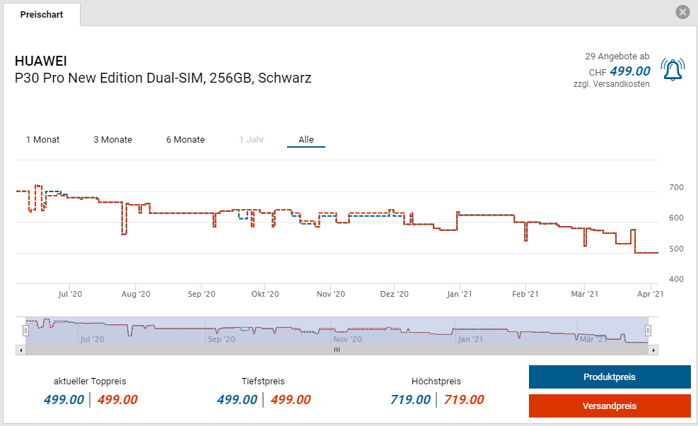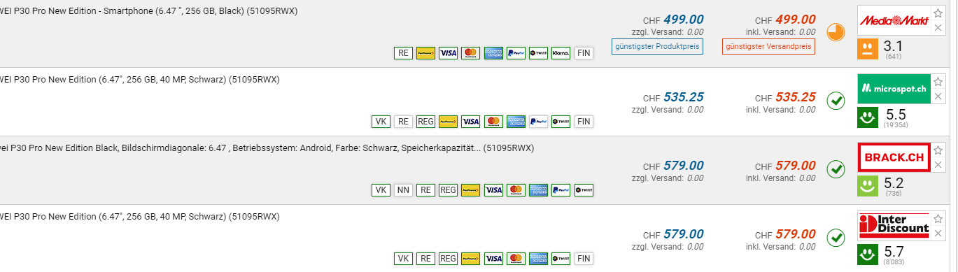Bei Media Markt ist das HUAWEI P30 Pro New Edition momentan im Oster-Sale für den neuen Bestpreis von CHF 499.-. Der vorherige Bestpreis war CHF 521.-. Der zweitbeste Preis beträgt CHF 535.25.