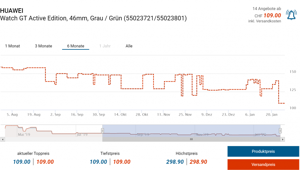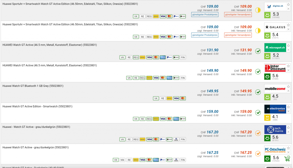 Bei Galaxus erhält man gerade die Huawei Watch GT Active Edition für CHF 109.- Müsste neuer Bestpreis sein. Zweitbester Preis liegt bei CHF 131.90, Bestpreis bisher bei CHF 119.-