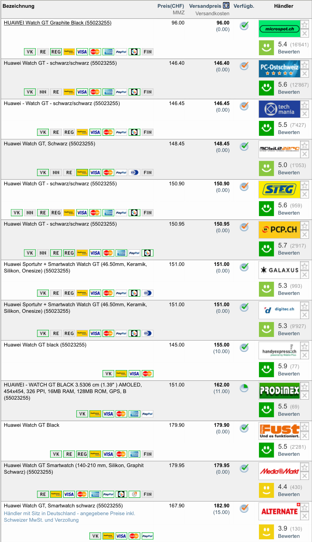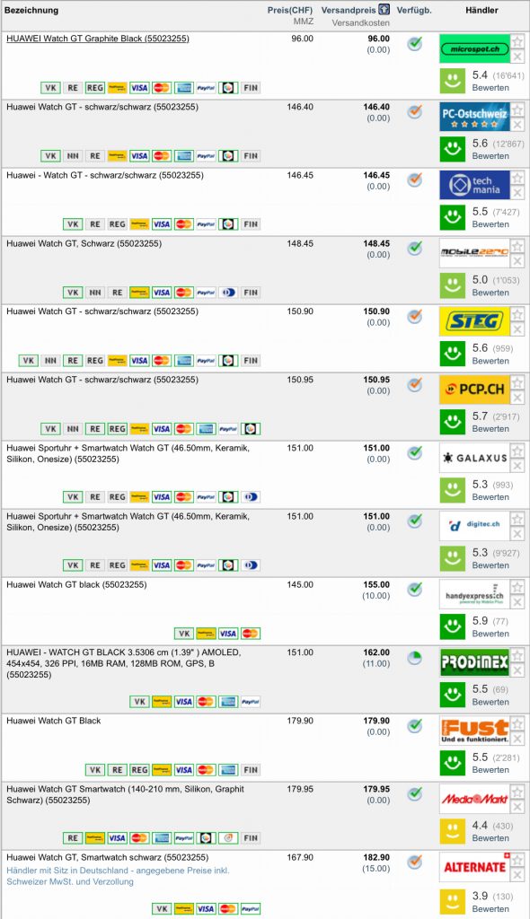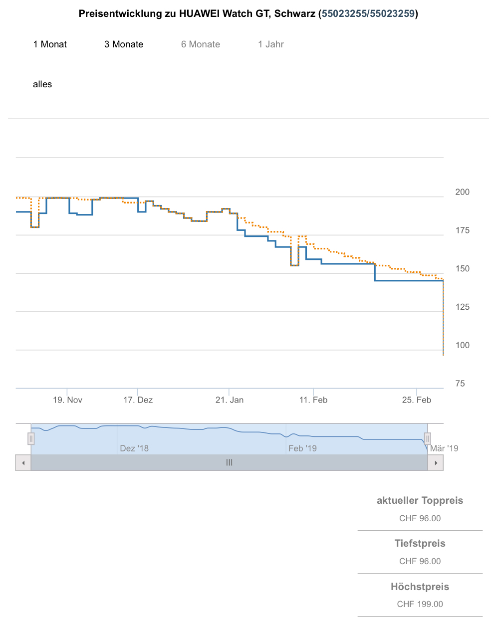 Schaut mal auf den Inserat Seiten falls ihr das Teil wirklich wollte. Gibt immer noch ein haufen Leute die ihre Huawei Watch GT loswerden wollen die sie beim vorbestellen des Mate 20 Pro umsonst bekommen haben. Zum glück bin ich meine damals losgeworden für 150Sfr. Hätte nich gedacht das der Preis so schnell fällt.