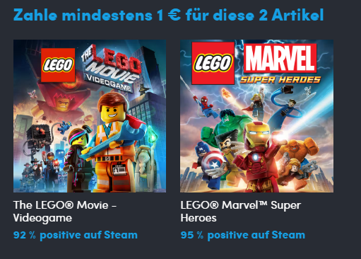 Bereits bei 1€ erwarten euch die Games The LEGO Movie Videogame sowie LEGO Marvel Super Heroes, welche beide auf Steam einen guten Bewertungsschnitt geniessen: