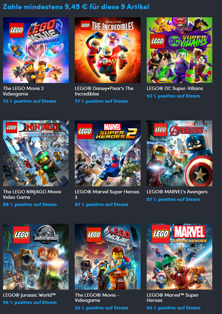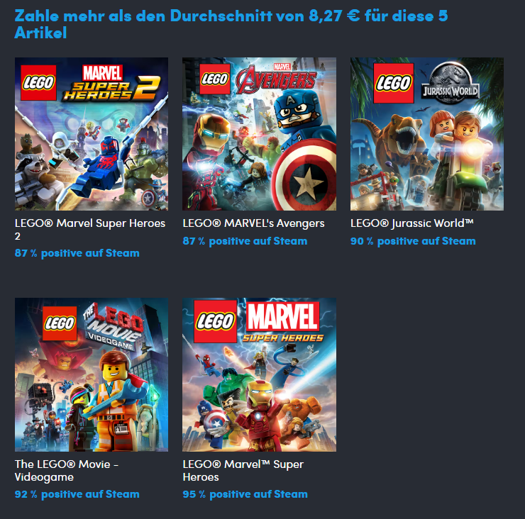 Falls ihr mehr als 8.27€ hinblättert, kommen die 3 Games LEGO Marvel Super Heroes 2, LEGO Marvel’s Avengers und LEGO Jurassic World dazu: