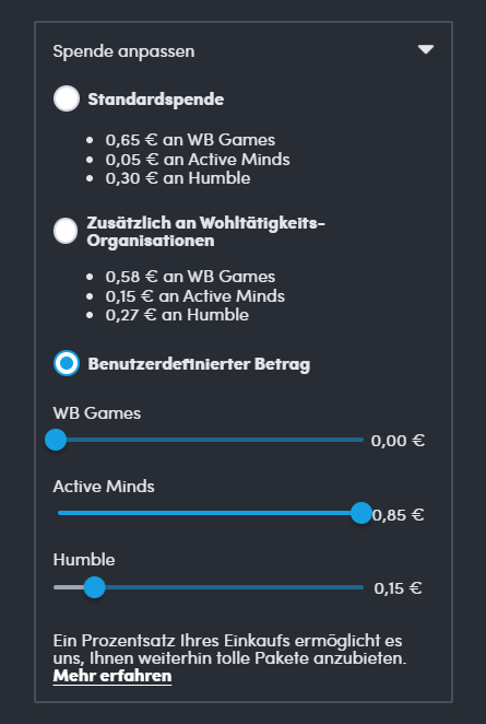 Falls jemand HumbleBundle noch nicht kennt: Ihr spendet hier einen freiwillig gewählten Betrag und erhaltet dafür Keys für diverse Games. Ihr könnt dabei auch selbst auswählen, wieviel Geld der vorausgewählten Organisation zugute kommen sollte. Um mindestens das Hauptspiel des Angebots zu erhalten, müsst ihr 1€ bezahlen. Falls ihr mehr wollt, müsst ihr einen spezifisch definierten Wert spenden, der weiter wächst, je mehr Leute vom Angebot Gebrauch machen.