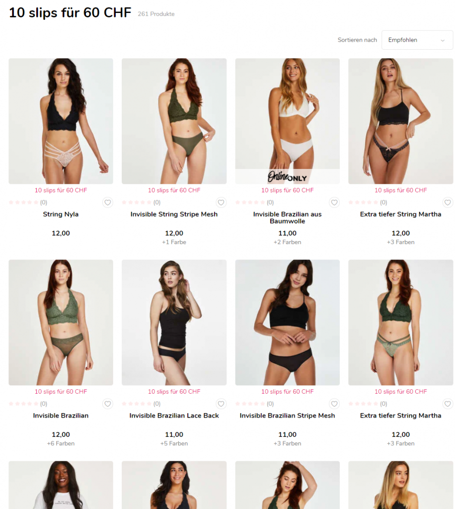 Bei Hunkemöller gibt es momentan 10 Slips für CHF 60.- es kommen jedoch noch CHF 9.90 Versandkosten dazu. Nichtsdestotrotz sind CHF 6.90 pro Slip ein fairer Preis. Zur Auswahl stehen über 262 verschiedene Artikel zur Verfügung, es hat also genügend Auswahl. 😀 Normalpreis kosten die Slips min. CHF 11.-