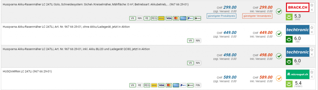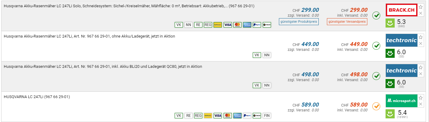 Bei Brack gibt es den HUSQVARNA Akku-Rasenmäher LC 247 für den neuen Bestpreis von CHF 299.-. Der vorherige Bestpreis war CHF 349.-. Der zweitbeste Preis beträgt CHF 449.-.