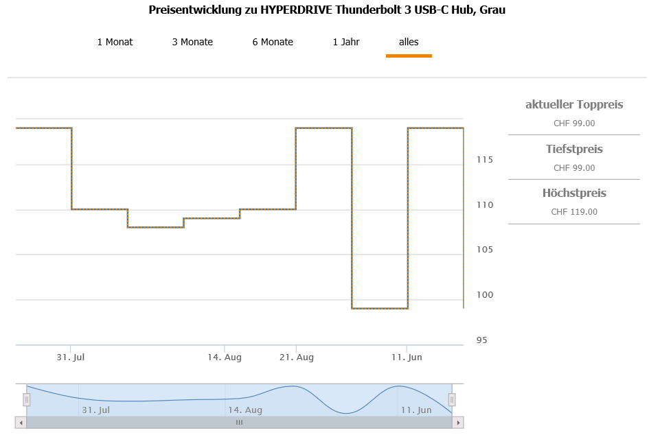 Gemäss toppreise war der bestprice bislang bei 99.- CHF was zugleich aktuell auch der zweitbeste Preis ist.
