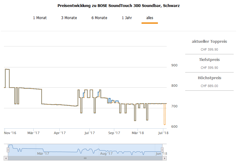 Gemäss toppreise gab es die Soundbar noch nie günstiger als für 617.50 CHF. Zweitbester Preis aktuell bei 721.- CHF.