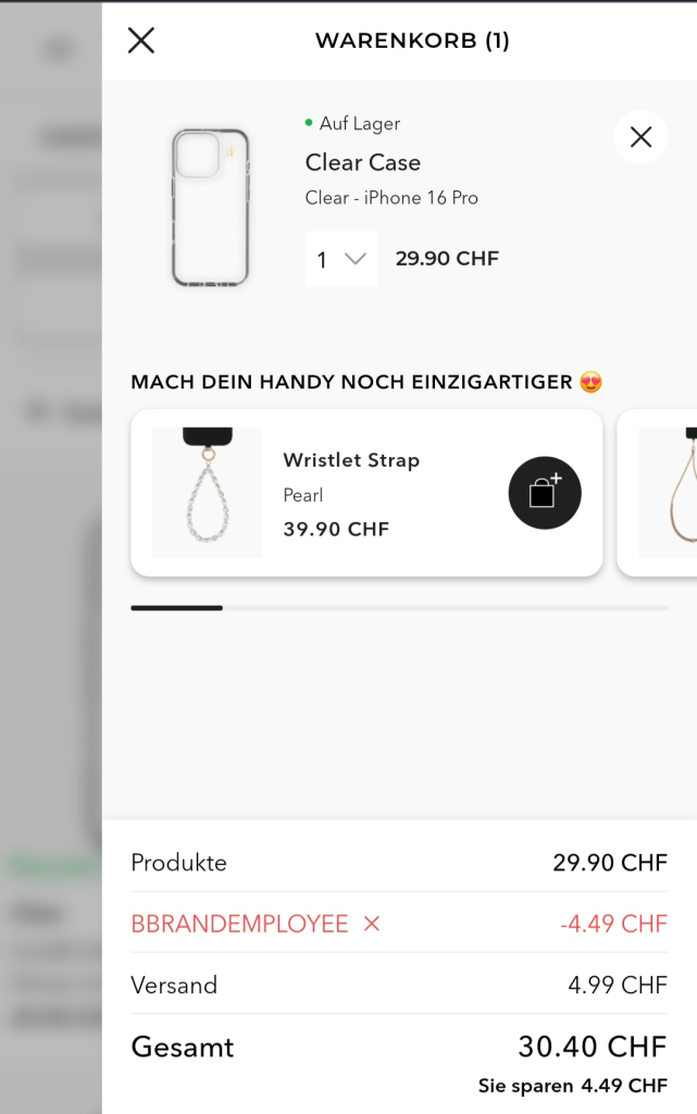 Beispiel: iDeal of Sweden - iPhone 16 Pro Clear Case zu einem Preis von CHF 30.40.- (inkl. Versand). Der Vergleichspreis (Apfelkiste) liegt bei CHF 44.95.-.