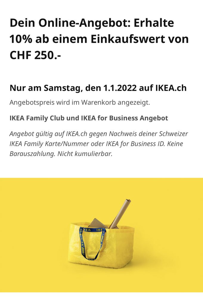 Ikea 10% Rabatt ab 250.- am 1.1.22 auf ikea.ch